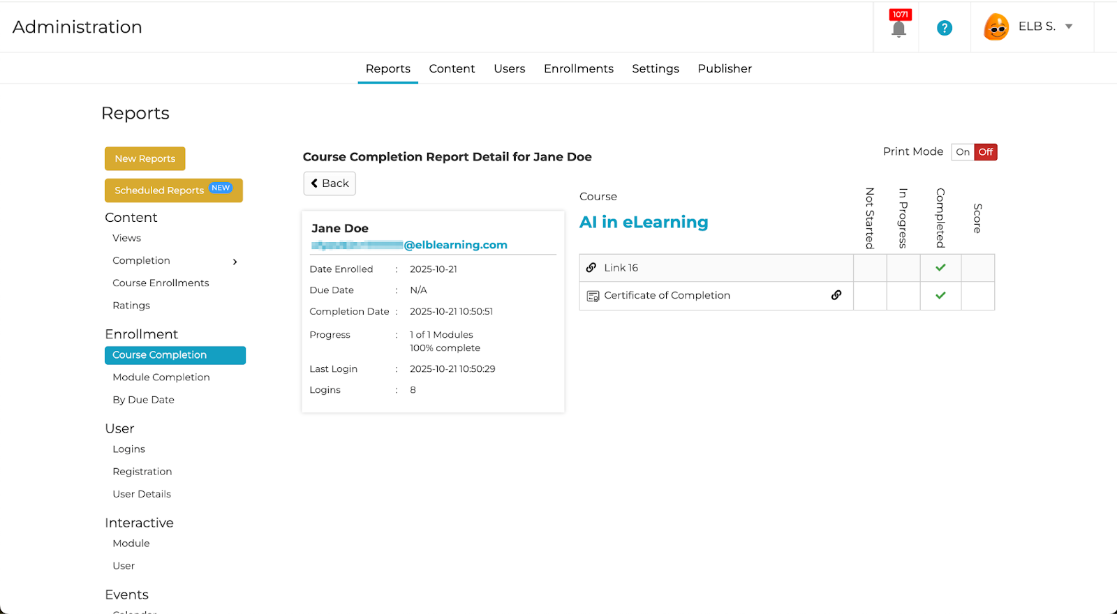 - Enrollment Course Completion Report