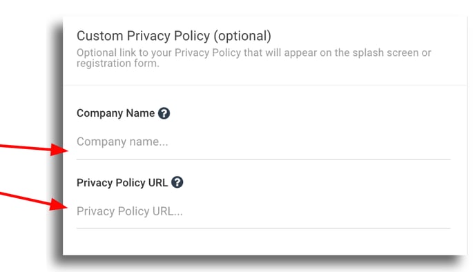 • Adding a company Privacy Policy is optional and will add a link to the policy on the splash screen of the game.