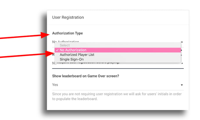 No authorization – this setting allows players to play games in “anonymous mode” when used in conjunction with having the leaderboard turned off.