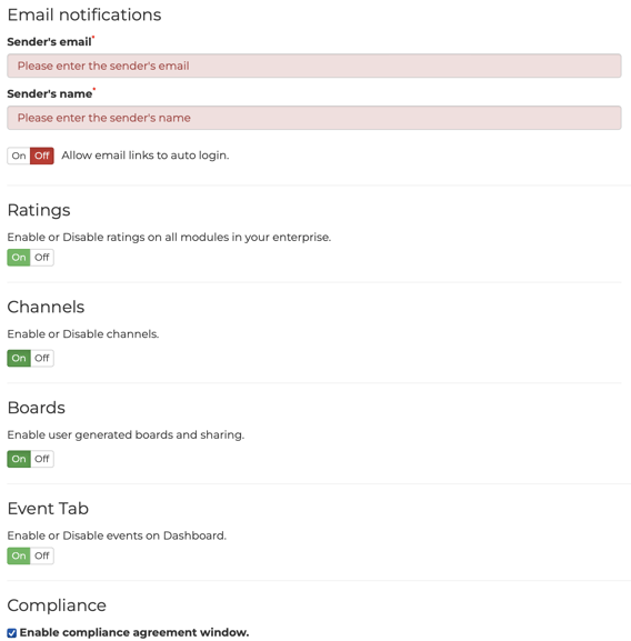 Settings for each enterprise: branding (logos, colors, URLs, etc.), email notifications, module ratings, boards, channels, event calendar, copyright/ footer message, compliance/instructions message upon login, SSO and IdP settings