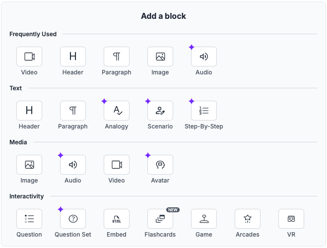 Blocks are logically grouped by category with a clutter-free design. AI-enabled blocks are clearly indicated, making it easier to find and use the right block while staying focused. - Frequently Used Blocks