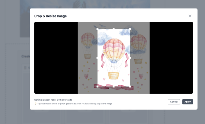 - The image from the author machine or from ELB owned library will trigger the Crop & Resize tool with the predefined dimension. This allows authors to decide which part of the image can be shown in the slide.