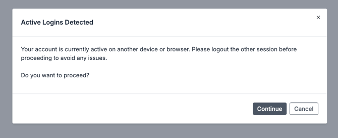 - Users will receive an alert prompting them to either log out of the existing session or cancel the new login attempt.