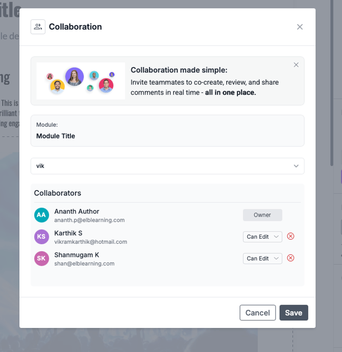 - The Owner/Author will always appear at the top of the collaboration list for easy visibility.