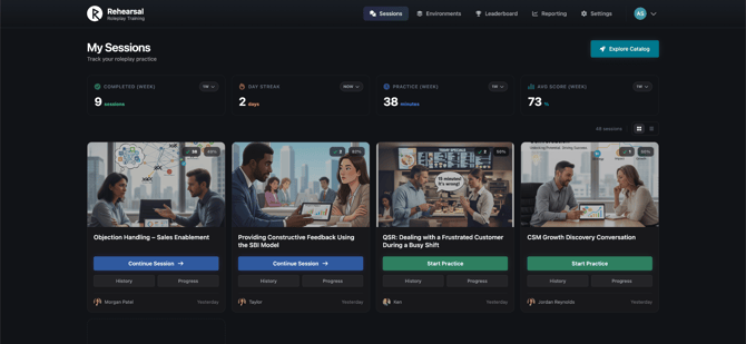 - Drill-Down Tables: Sort by Learner/Environment Name, Sessions, Best Score, Avg. Score, or Completion Rate. Default: Total Sessions (high to low).