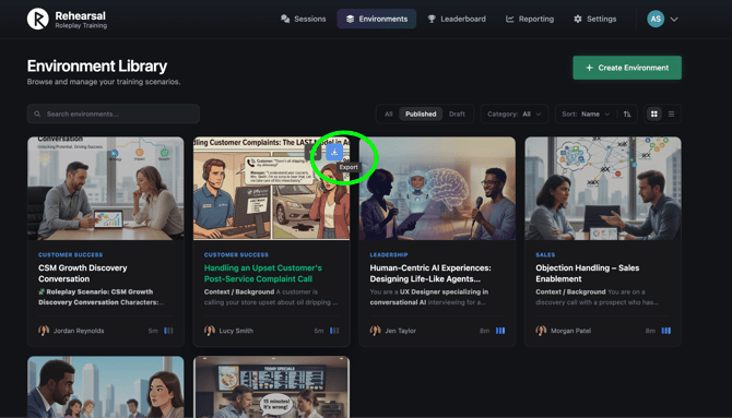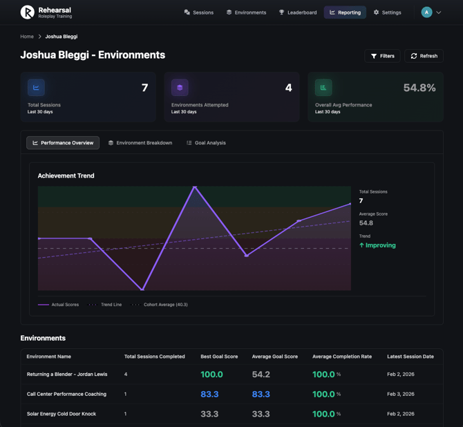 - Environments Tab: Sort by Environment Name, Total Sessions, Best Score, Avg. Score, or Avg. Completion Rate. Default: Environment Name A–Z.