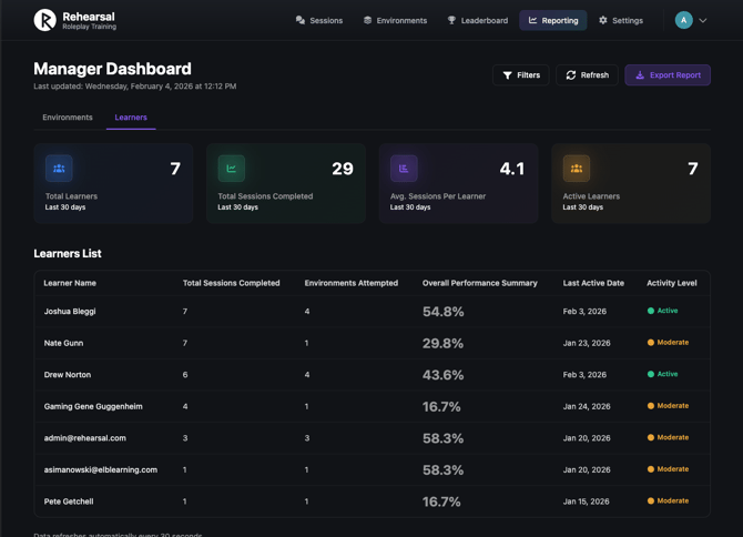 - Learners Tab: Sort by Learner Name, Total Sessions, Environments Attempted, Avg. Score, or Last Active Date. Default: Last Active Date (newest first).