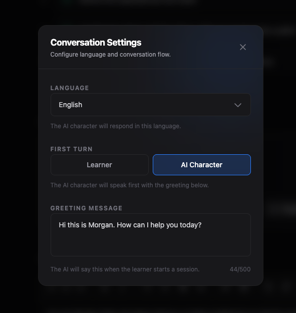 - AI takes the first turn: Toggle in Conversation Settings (via the language/role selector) to enable avatar greeting.