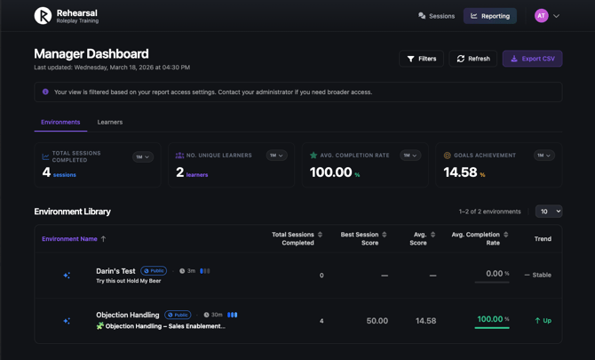 - Environment-Based Access: Restricted to assigned environments and learners with sessions in those environments. The Learners Tab is hidden for this user type.