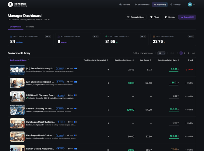 This release delivers a set of enhancements to the Roleplay Manager Dashboard, focused on data usability, access control, and export capabilities. Managers can now sort any table column, export dashboard data to CSV, and share dashboard access with non-admin users through a structured permission model. Also included are UI updates for the headers, environment listing, and pagination to reflect the new UI for consistency.