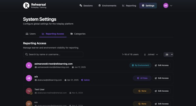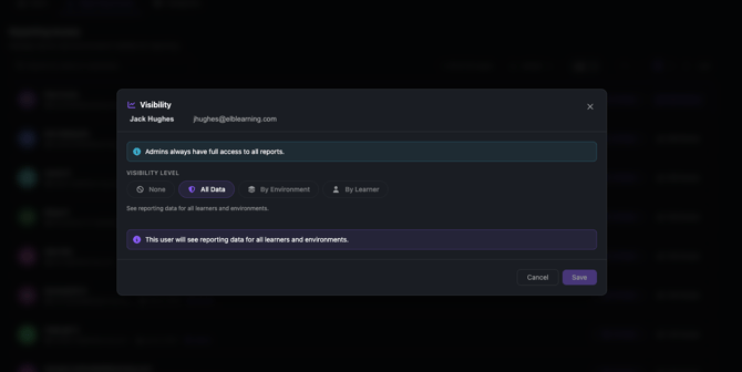 - Adds an Access Level column to the Settings → Reports user list, displaying one of: Full Access, Environment-Based Access, Learner-Based Access, or No Access — as color-coded badges.